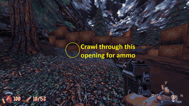 길을 따라 계속 가십시오. 아직 전방의 언덕을 오르지 말고 언덕 오른쪽으로 달려가 잘 숨겨진 탄약을 위해 총신 뒤로 점프하세요. 언덕을 향해 뒤로 물러서서 올라갑니다. 정상에서 컬티스트를 죽이고 나무 다리를 건너십시오. 먼저 오른쪽으로 돌아 텐트 옆에서 이교도를 죽이십시오. 왼쪽으로 가서 컬티스트를 더 죽이십시오. 비밀 지역의 텐트를 위해 바위를 오르십시오.
