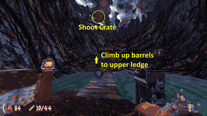 일부 무기 부품이 아래로 떨어지도록 위의 크레인이 들고 있는 상자를 쏴라. 그것들을 얻은 후에 탄약을 위해 배럴을 여기 상단 플랫폼으로 올라가십시오.