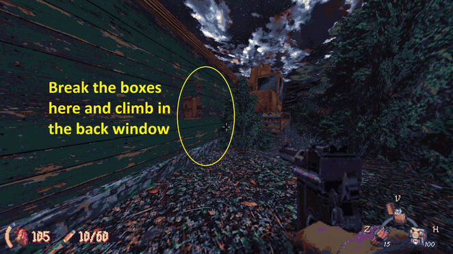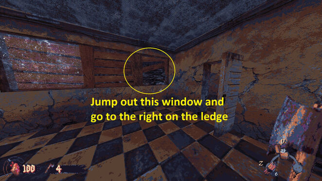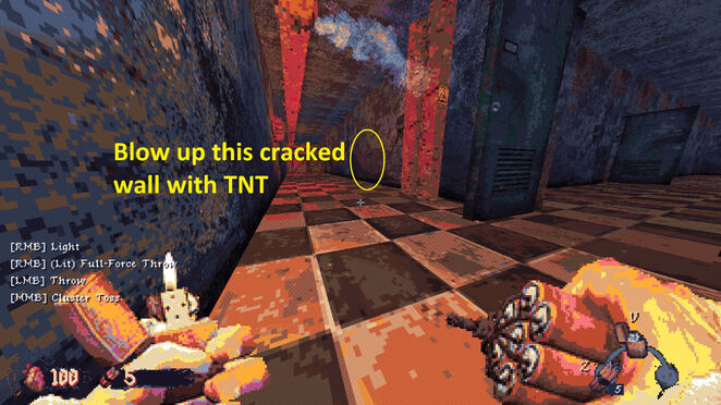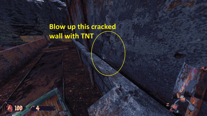난간을 따라 건물 오른쪽으로 걸어가면 금이 간 벽을 발견할 수 있습니다. 갑옷, 탄약, 잘린 산탄총, 화염병을 포함한 좋은 물건으로 가득 찬 비밀 방을 위해 TNT로 폭파하세요!