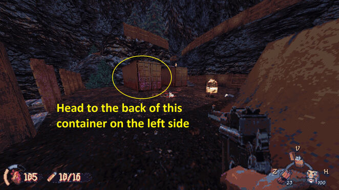 여기에서 아이템을 수집한 후 다음 동굴을 계속 진행하세요. 길이 갈라집니다. 오른쪽 경로는 잘린 샷건으로 이어집니다. 그것을 잡고 다른 길로 돌아갑니다. 경비원과 싸우고 문을여십시오. 당신은 두 명의 광신도 뒤에 있을 것입니다. 탄약을 절약하기 위해 손도끼를 들고 그들 뒤로 쉽게 몰래 다가갈 수 있습니다. 아래를 내려다보고 이교도들을 보는 대로 죽이면서 여기까지 내려가세요. 계단이 길고 적들이 멀기 때문에 검은 로브 광신도를 먼저 제거한 다음 손도끼를 휘두르는 광신도를 제거하면 됩니다. 하단에는 3개의 배송 컨테이너가 있습니다. 울타리 뒤에 있는 좋은 물건을 보려면 왼쪽을 보십시오. 이 작은 지역으로 들어가려면 문을 막고 있는 상자를 쏘기만 하면 됩니다. 준비가 되면 중간 컨테이너의 상자를 부수고 안에 있는 산탄총 광신도를 죽이십시오.