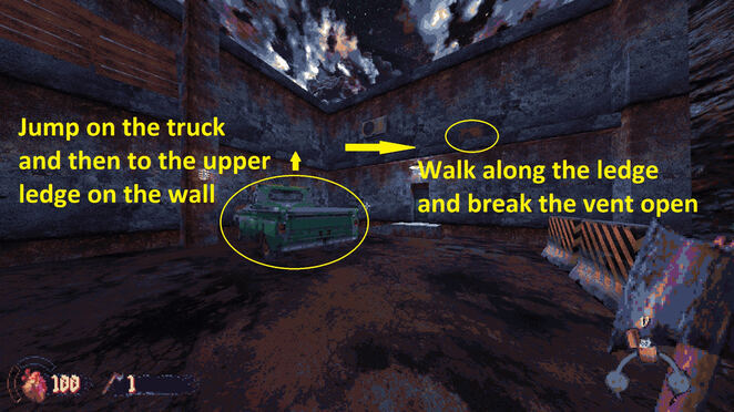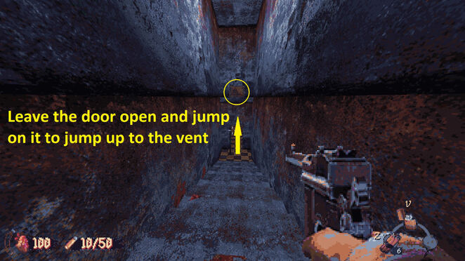 계단에서 돌아서 문 위를 보십시오. 여기 통풍구가 있습니다. 문으로 뛰어 올라 환풍구로 올라갑니다. 무기 부품이 포함된 또 다른 비밀을 찾아보세요.