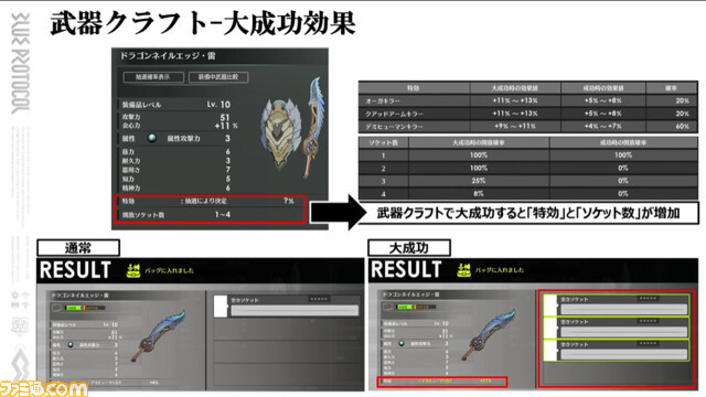 무기 크래프트 시에는 대성공이라는 개념이 존재한다. 대성공을 하면 무기의 특공치와 소켓수가 증가하고, 이 소켓에 플러그를 장착시키는 것으로, 무기의 능력을 향상시킬 수 있다.