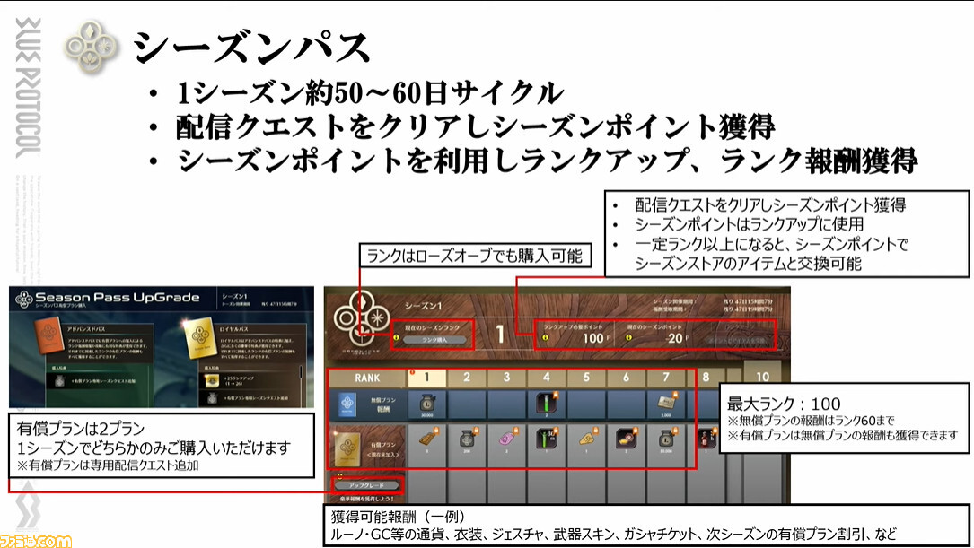 - 시즌 패스에는 무료 플랜과 유상 플랜이 있습니다. 무상 플랜의 보상은 랭크 60까지, 유상 플랜은 100까지 존재한다.