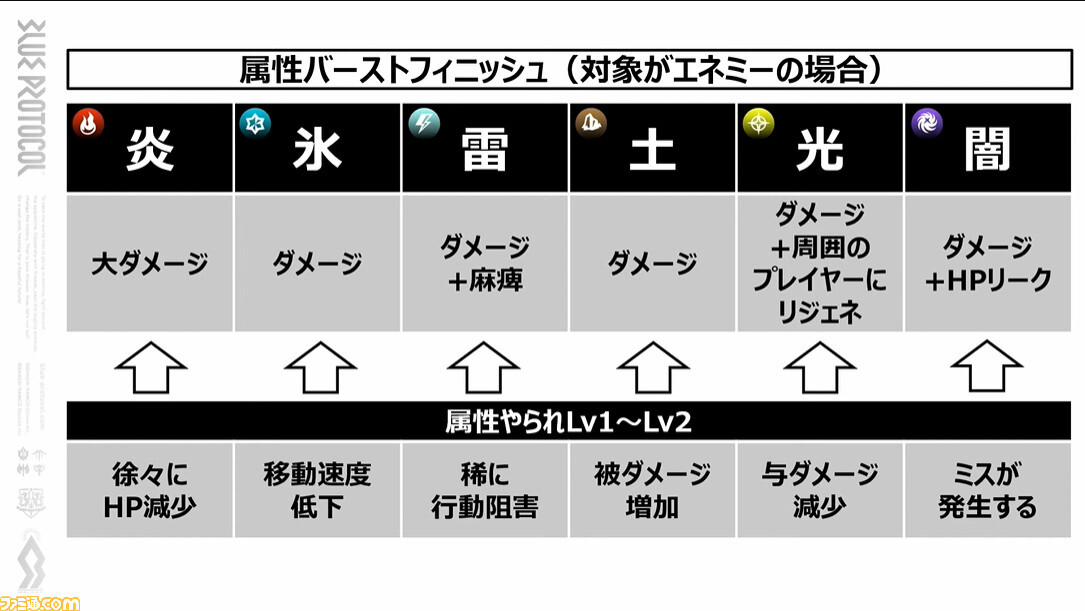 속성 버스트 중에는, 데미지를 줄 때마다 데미지가 축적해 가고, 시간 경과로 속성 버스트의 피니시 효과가 발생. 마무리 효과는 속성마다 다양합니다.