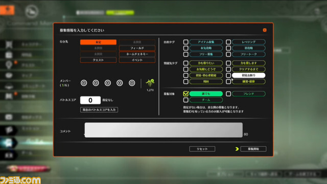 파티에 참가를 희망하는 사람은 조건에 맞는 모집에 응모하여 참가할 수 있다. 또, 모집 ID를 아는 사람만이 참가할 수 있는 비공개 모집도 가능.