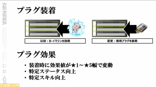 이전에 실시된 클로즈드 베타 테스트에 "융착"이라는 시스템에서 실시되고 있던 기능을 브러쉬 업하여 새로운 기능 "플러그 장착"으로 구현.