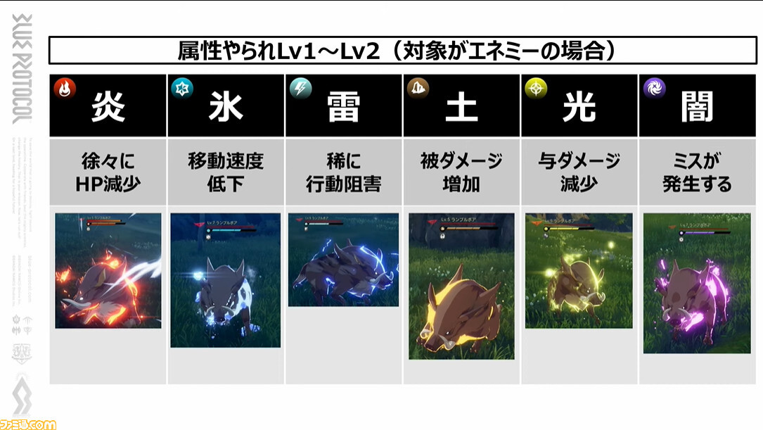 본작에서는 6개의 속성이 존재한다. 이 속성으로 에너미를 공격하거나, 플레이어가 공격을 받으면 속성을 당하는 상태가 된다. 속성 처리 상태에서는 속성마다 효과가 다른 효과의 디버프가 부여된다.