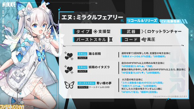 ・소생이 1회까지 밖에 할 수 없고, 버스트 스킬로 자동적으로 발동되어 버리기 때문에, 버프와 입어 임의의 타이밍으로 치기 어렵다. 버스트 스킬의 쿨타임이 60초로 상당히 길기 때문에 버스트 스킬 II의 니케를 2체 편성할 필요가 있다.