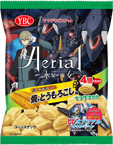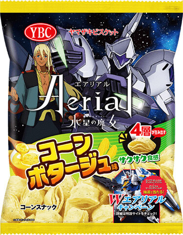야마자키 비스킷의 옥수수 스낵 「에어 리얼」과 「기동전사 건담 수성의 마녀」가 콜라보한 상품이 순차 발매되어, 「시미 맛」, 「농후 체다 치즈 맛」, 「구운 옥수수 맛」, 「옥수수 포타주 맛」 등이 전개하고 있다. 각 패키지에는 주인공의 스레타 머큐리를 비롯한 각 캐릭터가 그려져 있다.