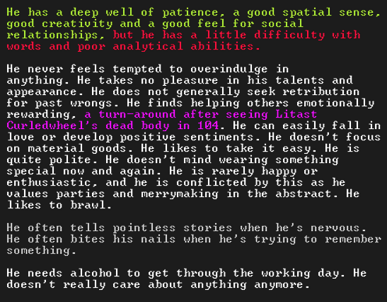 도시 건설자 및 이와 유사한 플레이어가 독립적으로 상상 해야 하는 가슴 아픈 이야기 , 종종 "팬픽션"을 위한 공간을 만들기 위해 게임에서 제공하는 많은 세부 사항을 무시합니다. 음, Dwarf Fortress 는 그 모든 것과 그 이상을 시뮬레이션합니다 . 당신이 읽은 것은 공식 서브레딧 에서 번역된 이야기로 , 실제로 게임에서 쉽게 찾을 수 있는* 수많은 세부 사항이 생략되어 있습니다 . 사고 경위, 두 난쟁이의 성격, 사고 지역의 바람 세기, 심지어 과부의 마지막 생각과 같은 사양은 우리가 역사를 재구성하기 위해 확인할 수 있는 데이터의 일부에 불과합니다. 모든 이벤트.