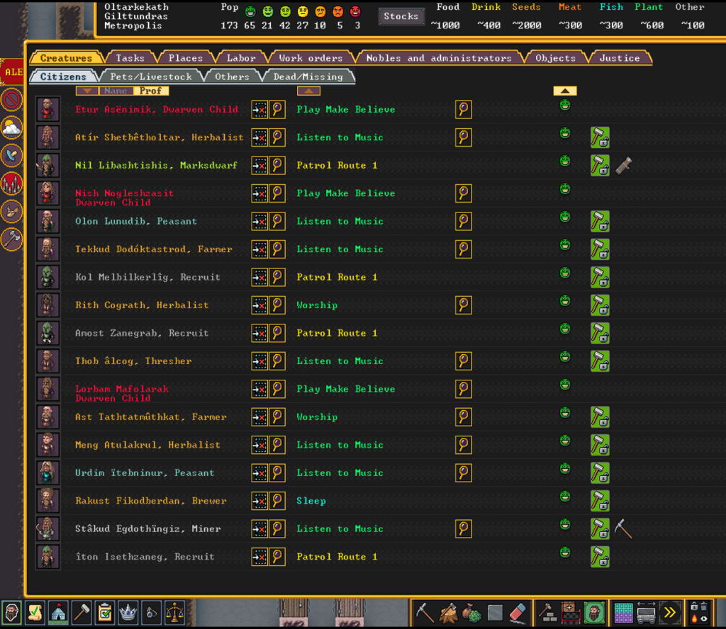 또한 일부 메뉴에만 검색 기능 과 결과 필터가 있습니다. 가장 필요한 메뉴, 무엇보다 시민들의 목록에 아주 소중한 검색창이 빠져 있는 일이 발생한다. 일부 삶의 질 향상 은 너무 간단하고 필요하기 때문에 개발자가 스스로 그것에 대해 어떻게 생각하지 않았는지 궁금할 정도입니다. 여전히 사소한 결함이지만, 194명의 드워프 를 직접 선택하여 비상 대피소에 배정한 다음 이에 대해 이야기하겠습니다.