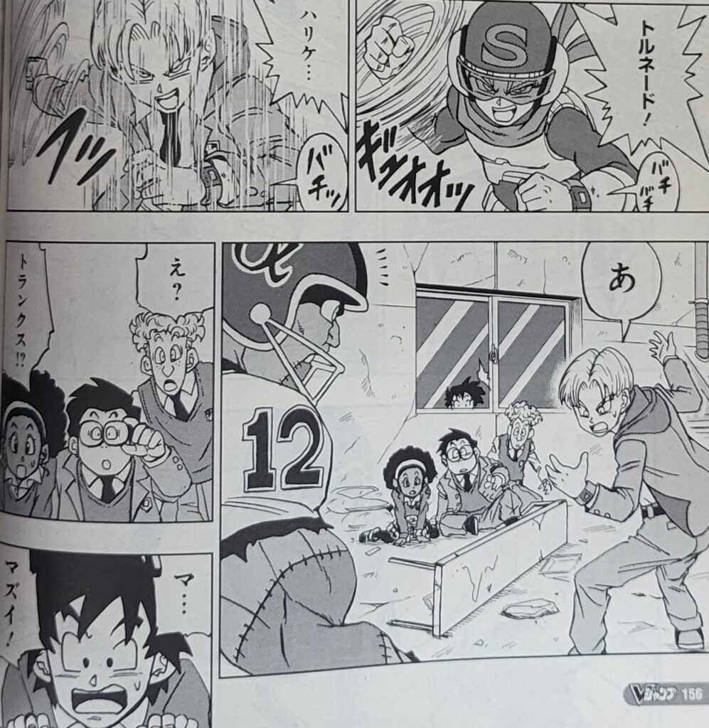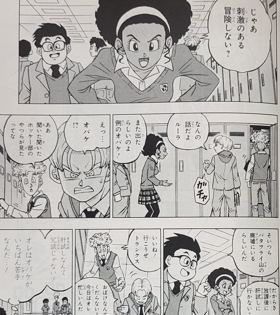 챕터 동안 Goten과 Trunks는 슈퍼 영웅 이야기를 시연합니다. 특히 이 10대 트랭크스에 대해 많은 것을 알게 될 것입니다. 예를 들어, 우리는 그가 컴퓨터를 잘 다루지 못하고 유령을 두려워한다는 것(Goten 자신도 그에게 지적할 것이기 때문에 이것은 너무 이상합니다) 그리고 무엇보다도 그의 삶에서 더 많은 스릴을 원한다는 것을 알고 있습니다.