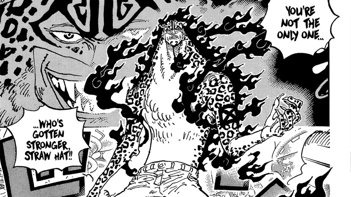 Lucci도 Luffy와 같은 새로운 악마의 열매 힘을 얻었습니다. 이전 모습과는 확연히 다른 표범 형태로 변신한다. 기어 5로 변신한 루피의 흰 구름처럼 검은 뱀 구름이 그의 목을 감쌉니다. 양측은 각자의 동지들을 진정시키려 애쓰고 있다.