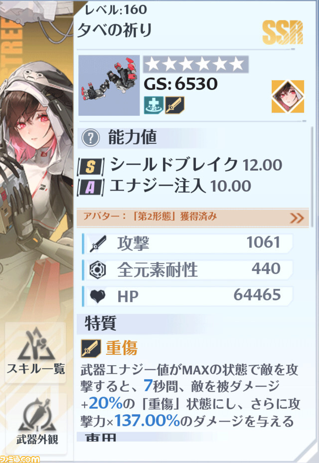 무기 에너지치가 MAX 상태에서 적을 공격하면 7초 동안 적을 피해 데미지 +20%의 "중상" 상태로 하고, 더욱 공격력×137.00%의 데미지를 준다.