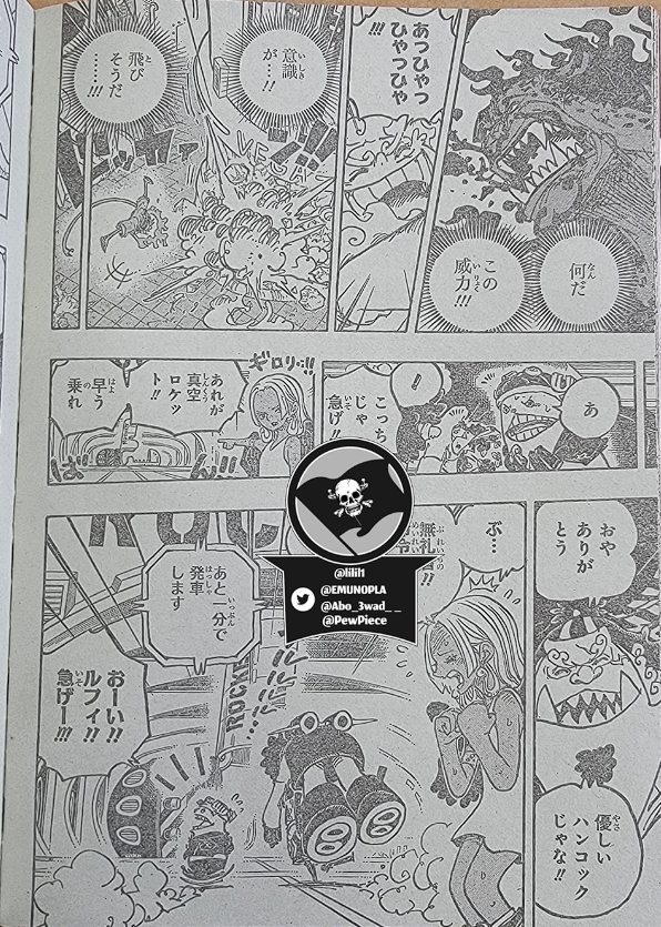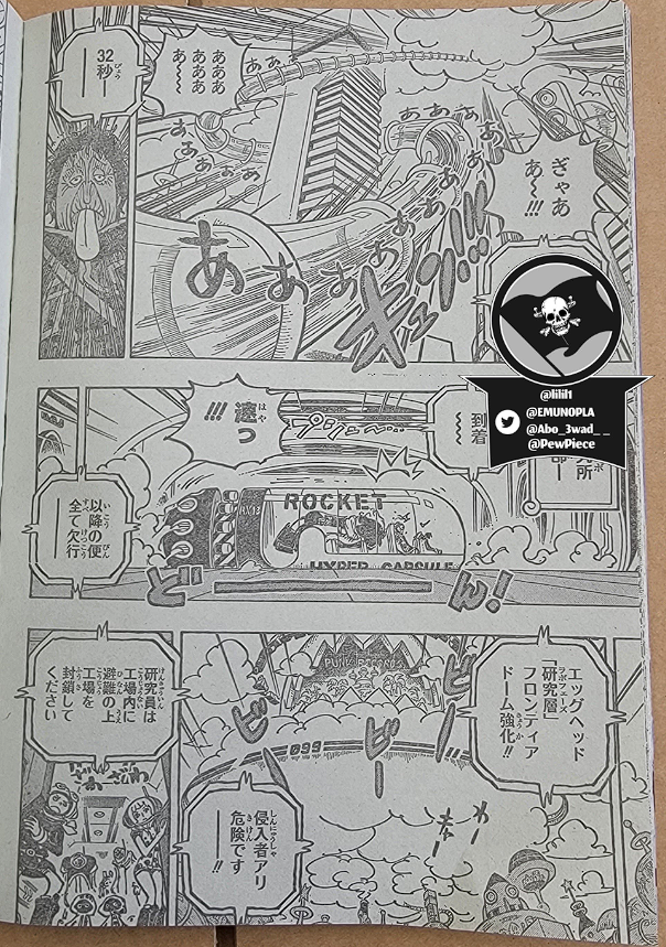 보아 핸콕의 세라핌은 성공적으로 쵸퍼와 징베를 로켓의 안전한 곳으로 호위했고, 루피는 그들에게 다가가기 위해 싸움을 멈춥니다. 그룹은 Gear Fifth를 사용하고 퇴보하고 노인이 된 Luffy와 함께 실험실에 액세스 할 준비를합니다. Sentomaru는 여전히 다운되어 있고 CP0은 Seraphim을 장악 했습니다. 한편 Kizaru도 Egghead에 도착합니다.