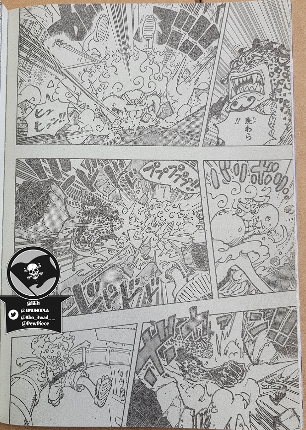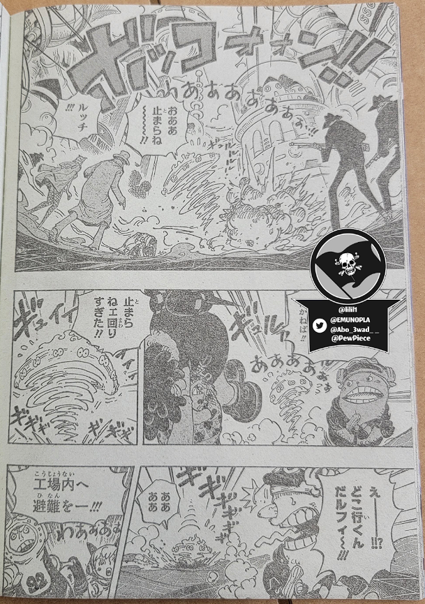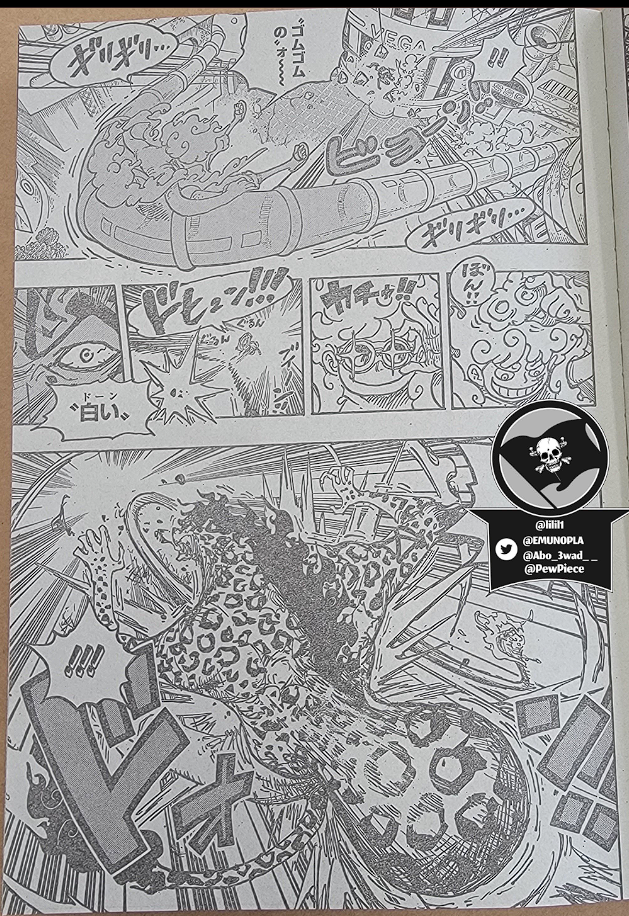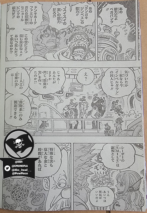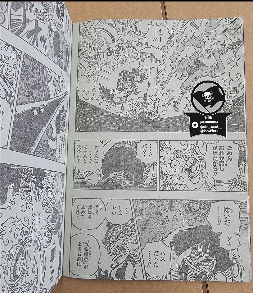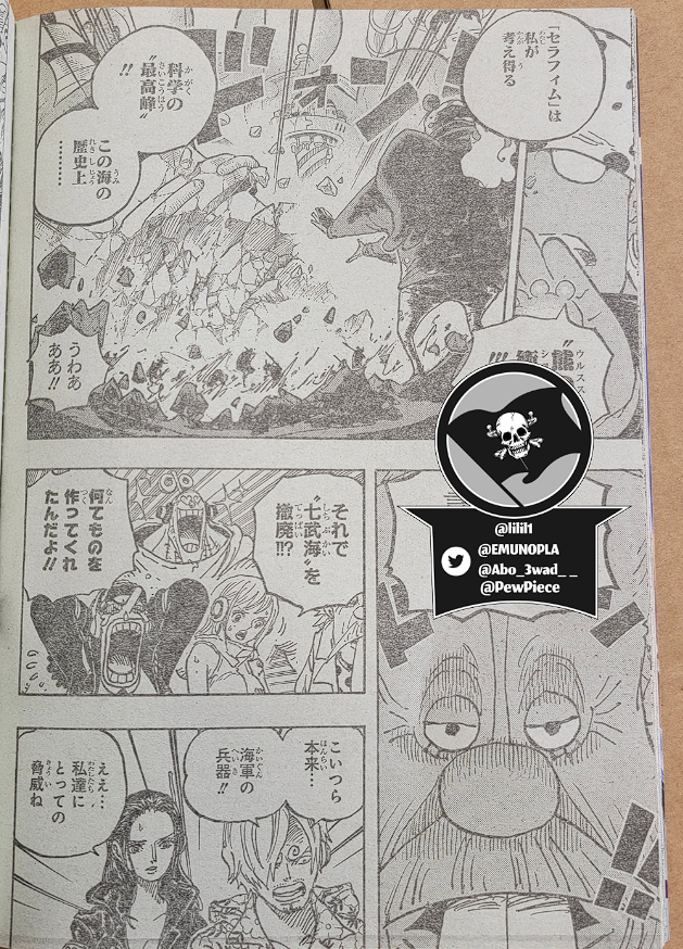 Boa Hancock의 Seraphim이 Mero Mero 와 Seraphim Kuma Bartholomew에게 Pad Pad의 힘을 발휘하는 동안 Vegapunk는 Zoo Zoo가 동물을 기반으로 하기 때문에 재현하기 쉽고 Paramishas의 경우 소유자의 유전적 요소가 필요하다고 설명합니다. 그런 다음 전투가 계속되며 이 시점 에서 Lucci가 다른 공격을 받는 Jump Festa에서 Oda가 보여준 스포일러 페이지가 표시됩니다 .