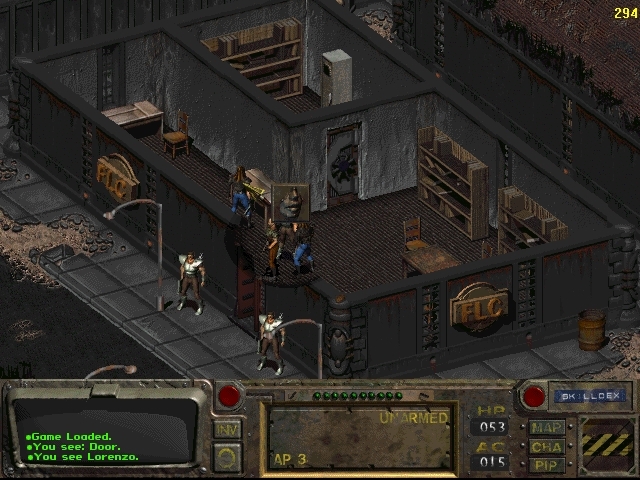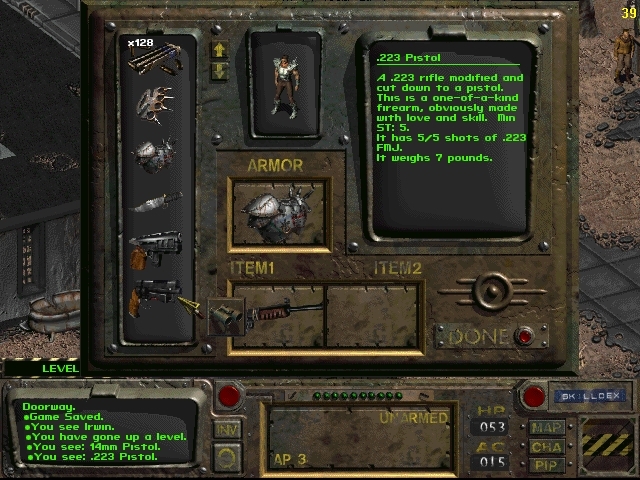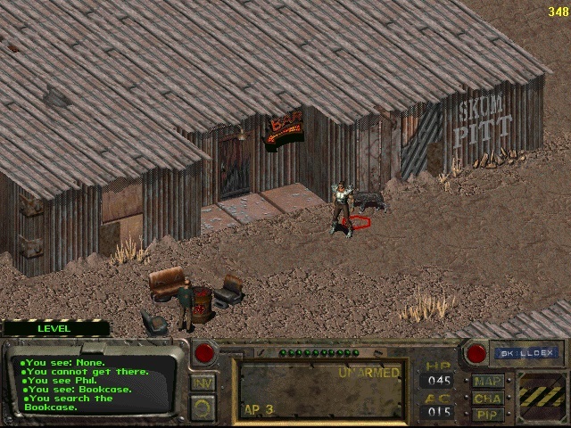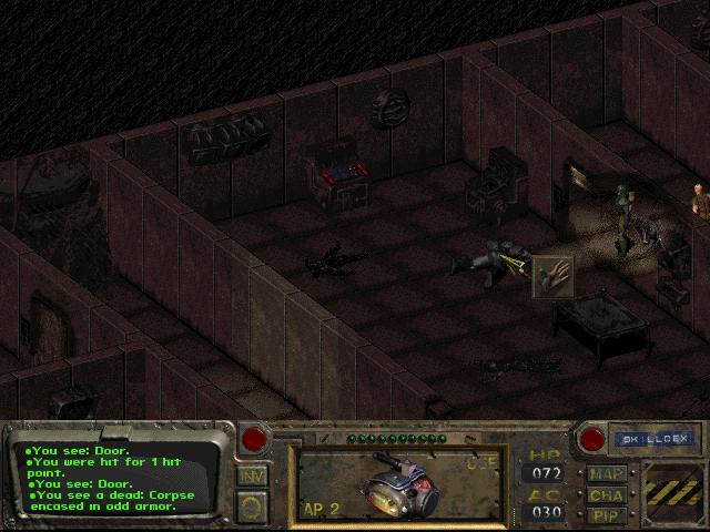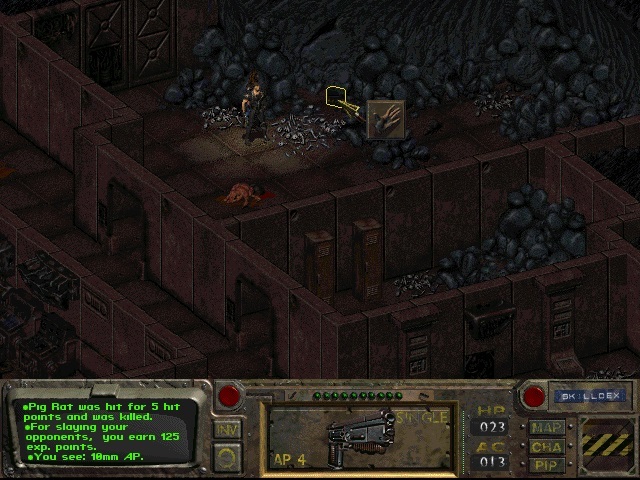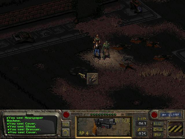 감독관님들께 인사드리고 나서 출발하겠습니다. 처음에 시체가 옆에 있어야 합니다. 마우스 오른쪽 버튼을 클릭하여 모드를 변경하고 시체를 약탈합니다.[10mmAP]및 [칼] 동굴에는 거대한 쥐가 가득합니다. XP(쥐 한 마리당 25xp) 동안 쥐를 제거하는 것이 가장 좋습니다.여기에는 1920마리의 쥐가있다.칼을 사용해서 탄약을 다 쓰지 않도록 해. 지역 경계까지 동굴 헤드를 클리어하면 세계 지도와의 경계를 나타내는 지면 색상의 약간의 차이를 볼 수 있습니다. 지도 메뉴에서는 적이나 상인과 맞닥뜨릴 수 있으므로 준비에 시간이 걸리고 Vault 13을 저장할 수 있는 기간이 150일밖에 남지 않았습니다.