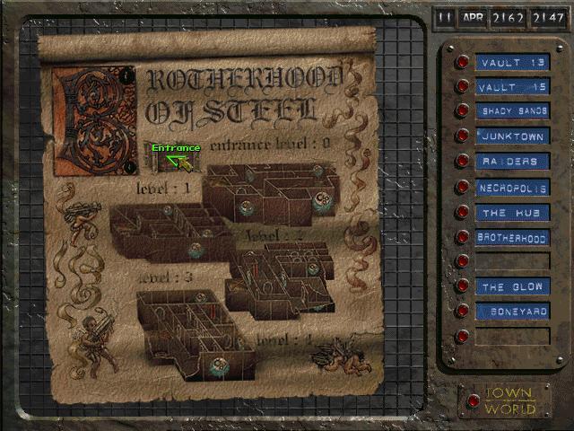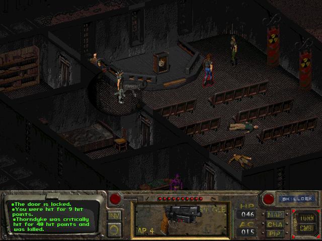 그리고 마지막 층에는 슈퍼 돌연변이 중위가 있다.그 250개의 히트 포인트, 개틀링 레이저, 그리고 개틀링 레이저를 가진 2개의 가드가 있습니다. 로켓 발사기그는 꽤 까다롭지만 223구경 권총을 사용하면 (혹은 강한 무기) 눈 앞에서, 그는 6번 정도 맞으면 죽을 거야. (대체 방법: 그에게 다가가서 공격한다.그의 경비는 로켓을 가지고 있다. 발사대와 레이저를 수집해서 중위를 다치게 할 겁니다 (경위와 경위 사망 후 락커 픽(lock pick) 죽은 간수들 옆에서요열쇠를 가져가라.
