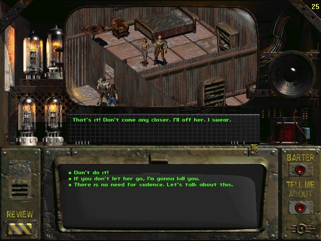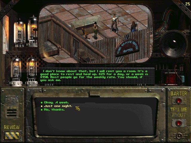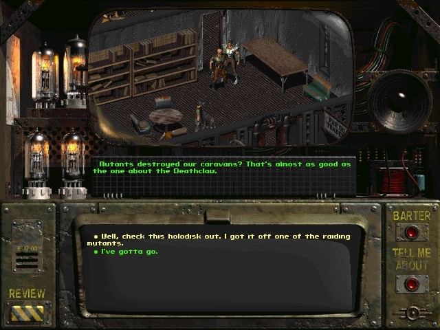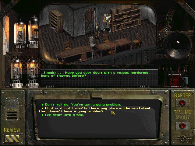 반복 가능한 퀘스트(옵션). - 다운타운 지역에서 북동쪽으로 이동합니다.크림슨 캐러밴에 들어가서 드미트르에게 말을 걸면 그는 당신에게 일자리를 제안하고 케리에게 말을 걸라고 할 것입니다(당신의 카리스마가 충분히 높으면 케리에게 말을 걸 수 있습니다(웃음).약간의 XP와 비용을 들여 작업을 시작할 수 있지만, 옵션으로는 워터칩이 아직 없기 때문에 염두에 두어야 할 시간이 많이 소요됩니다.