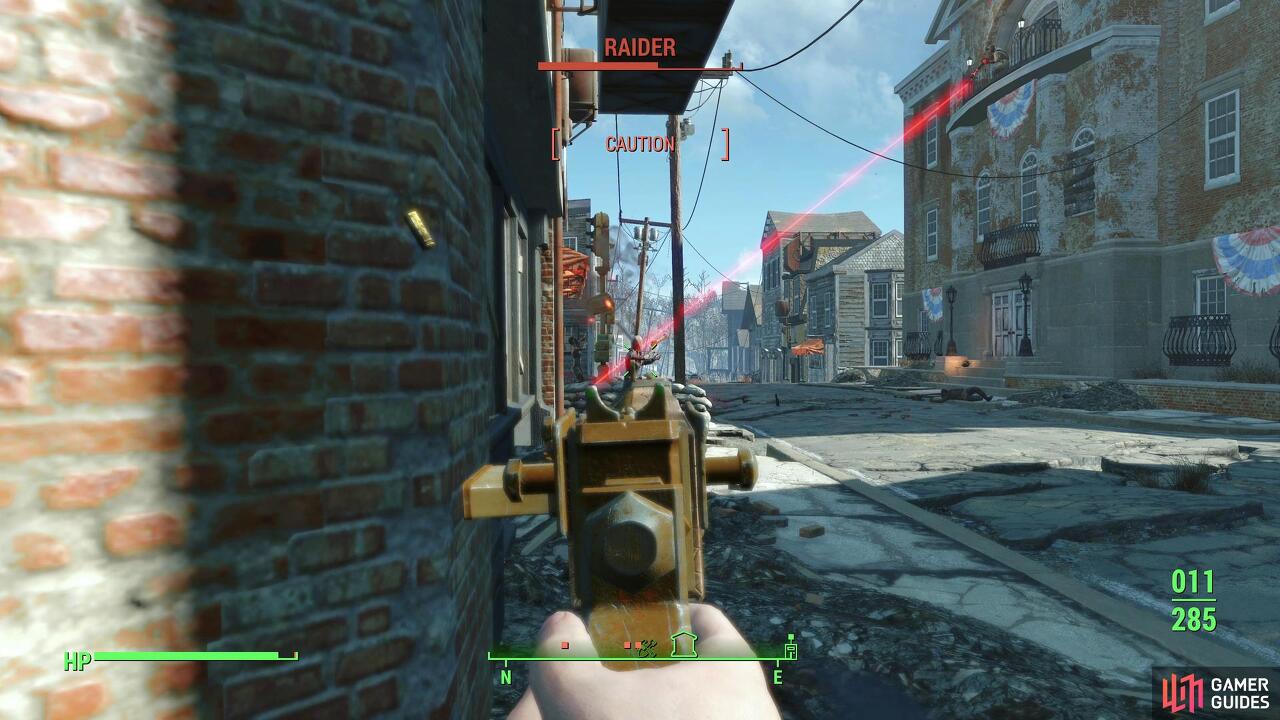 당신은 침입자들로부터 그들을 안으로 데려가려는 일부 정착민들을 구하기 위해 여기에 있습니다. 바로 위에 있는 일부 레이더를 목표로 삼을 수 있습니다. 왼쪽에 두 레벨 위에 하나가 있고 바로 위에 두 번째 레벨이 있습니다. 여기서 더 높은 적을 죽이면(VATS를 사용하여 어디에 있는지 확인) 다른 적을 트리거합니다. 그들은 다리 통로에 있는 상자 뒤에 숨으려고 하지만 오른쪽으로 가면 상당히 쉽게 그들을 비스듬히 잡을 수 있습니다.
