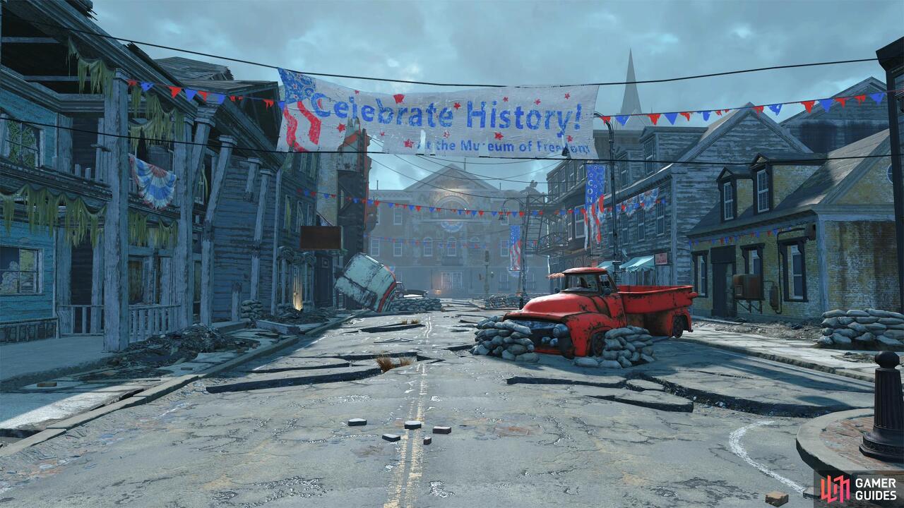 Fallout 4에서 자유가 부를 때 퀘스트에 대한 연습입니다 . 이 퀘스트는 콩코드의 자유 박물관 외부에 있는 침입자를 물리친 후 Out of Time 이 끝날 때 시작해야 합니다 .