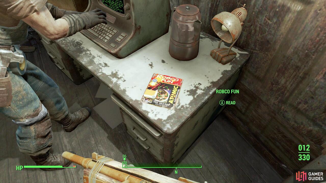 자, 이 방에는 몇 가지 멋진 것들이 있습니다. 무엇보다도 책상 왼쪽에는 가장 중요한 Perception Bobblehead 가 있습니다. 이 물건을 잡으면 Perception 기술이 영구적으로 +1 증가합니다. 아주 좋아요. 오래된 Atari 게임 "Missile Command"와 유사한 " Atomic Command Holotape "와 함께 제공되는 Sturges 근처의 Robco Fun 잡지 를 찾을 수도 있습니다 . 원할 때 사용해보십시오. 또한 여기에서 Sturges를 터미널에서 쫓아내고 [초보] 터미널이므로 직접 해킹할 수 있습니다. 그러나 일부 박물관 메모를 제외하고 실제 메모는 없습니다.