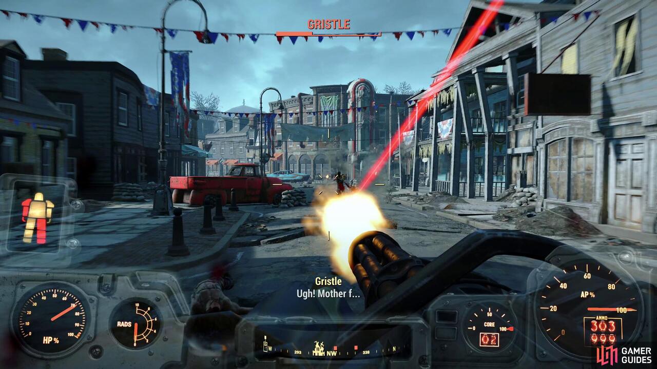 이제 멋진 목표가 생겼습니다. 해당 지역의 모든 적을 제거하십시오. 아래로 점프하고(파워 아머를 착용하면 낙하 피해를 입지 않음) 미니건을 사용해 보세요! 이것은 Raiders를 갈가리 찢을 것입니다. 당신이 완료될 때까지 그들 중 하나를 약탈하는 것에 대해 걱정하지 마십시오. Raiders를 쓸어버리고 마을의 시작 부분을 향해 전진하면 몬스터가 땅을 찢고 나타납니다... 바로 Deathclaw입니다! 이것은 멋진 Power Armor를 사용하더라도 게임의 첫 번째 "보스"로 간주될 수 있습니다.