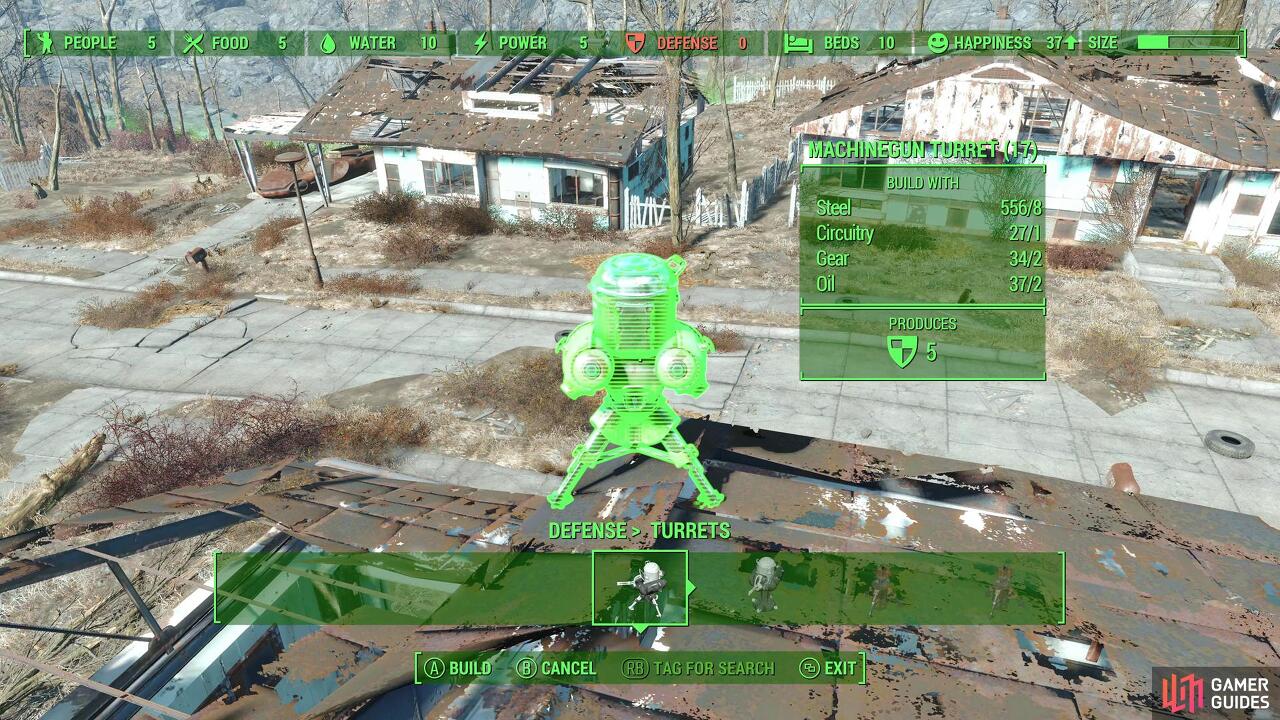 당신은 지금 훈련을 알고 있습니다. Sturges로 돌아가서 그에게 당신의 최근 업적에 대해 이야기하면 그는 무기력한 NPC를 제공하는 튜토리얼 퀘스트가 되어 그들이 새로 찾은 번영을 스스로 유지할 수 있도록 몇 가지 방어 시설을 구축하도록 요청할 것입니다. 관리할 수 있는 경우 "방어", "포탑" 범주로 이동하여 정착지에 기관총 포탑 2개를 설치합니다. 이것에 필요한 유일한 희귀 구성 요소는 회로이지만, 어느 정도 부지런했다면 여분의 몇 가지가 있어야 합니다.