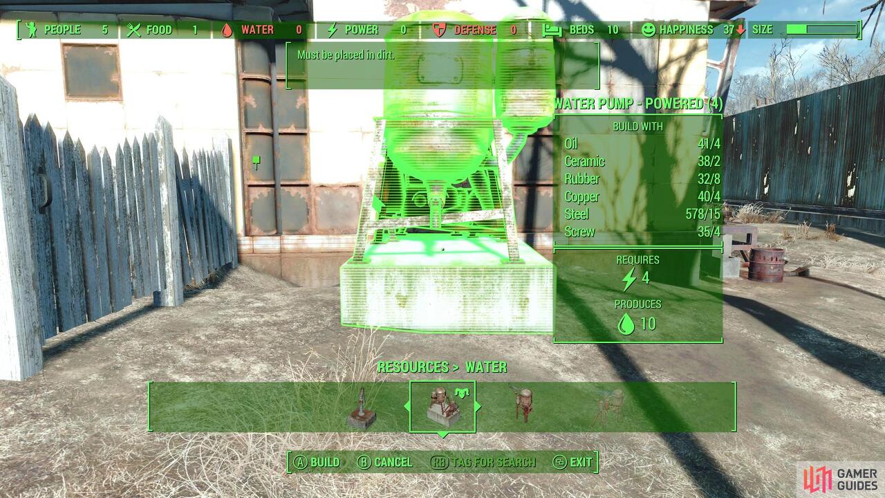 Sturges와 대화하면 두 번째 작업으로 이동합니다. 깨끗한 물 공급원 확보. 작업장 메뉴에 다시 들어가 "자원", "물 섹션"으로 이동합니다. 물 펌프는 저렴하고 만들기 쉽기 때문에 먼지가 있는 곳에 하나만 설치하거나 정착민당 물 한 단위가 필요하므로 두 개를 내려 놓으십시오. 워터 펌프당 3개의 물이 생성되며 만족해야 할 5명의 목마른 정착민이 있습니다. 지금은 두 개의 펌프로 충분합니다.