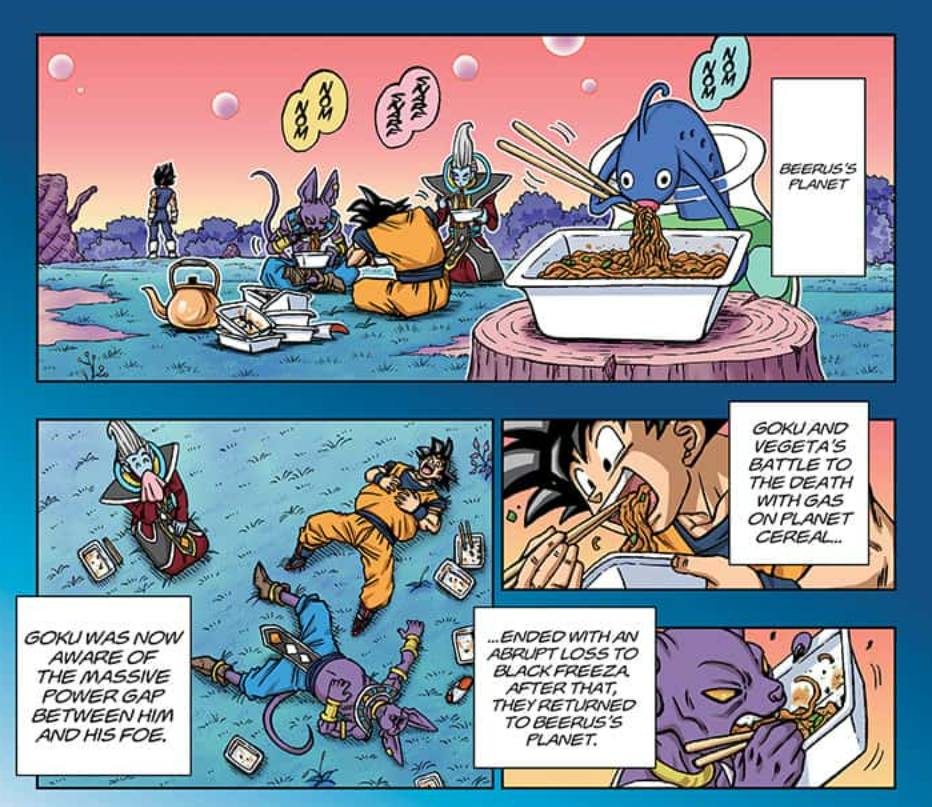 이 장의 첫 페이지에는 Cereal에서 일어난 일에 대한 간략한 요약이 제공됩니다. 즉, 우리는 Goku, Beerus 및 Whis가 이전 장의 끝에서 언급된 유명한 야키소바를 먹는 것을 관찰할 수 있습니다. 한편 배경에 처음 등장하고 만화가 잠시 동안 집중하는 Vegeta는 Freeza의 새로운 힘에 대해 다소 걱정하는 것 같습니다.