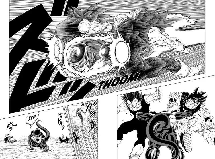 Dragon Ball Super 87 만화에서 Black Frieza 변신을 한 Frieza는 한 번의 타격으로 Gas를 죽인 후 두 Saiyans를 한 번의 펀치로 돌격합니다. 지금의 힘의 차이는 극심합니다.