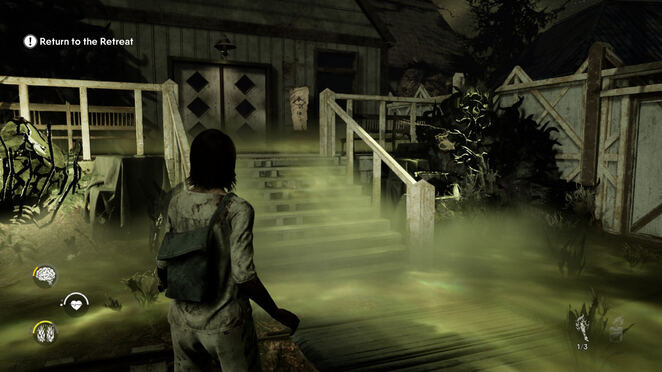 스트라이더를 처리한 후 앞으로 이동하여 보급품을 줍습니다. 퇴각장으로 돌아가서 노란 안개를 지나서 큰 집으로 좌회전하십시오. 4개의 작은 창문이 있는 문을 엽니다(나머지는 열 수 없음).