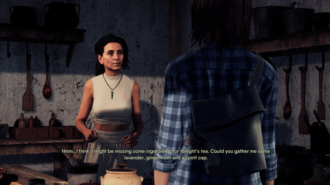 캠프에 들어가면 작은 건물로 바로 좌회전하여 요리하는 검은 머리 여성(Maya)과 대화하십시오. 그녀는 저녁 차에 사용할 몇 가지 재료를 찾아달라고 요청할 것입니다. 붙잡다의식 신성한 차 레시피카운터에서. Mind XP를 부여하려면 반드시 읽으십시오.