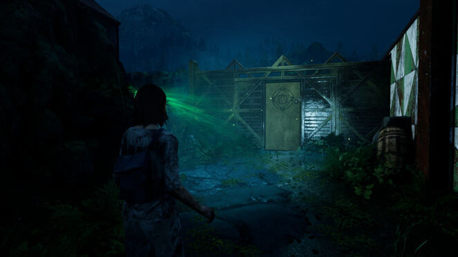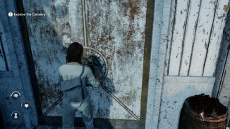 가면서 받은 손전등을 들고 다리를 건너 언덕을 올라갑니다. 맨 위로 올라가 이중문을 엽니다. 마구간으로 들어가 문을 열면 또 다른 이중문이 있습니다. 밀어내세요.