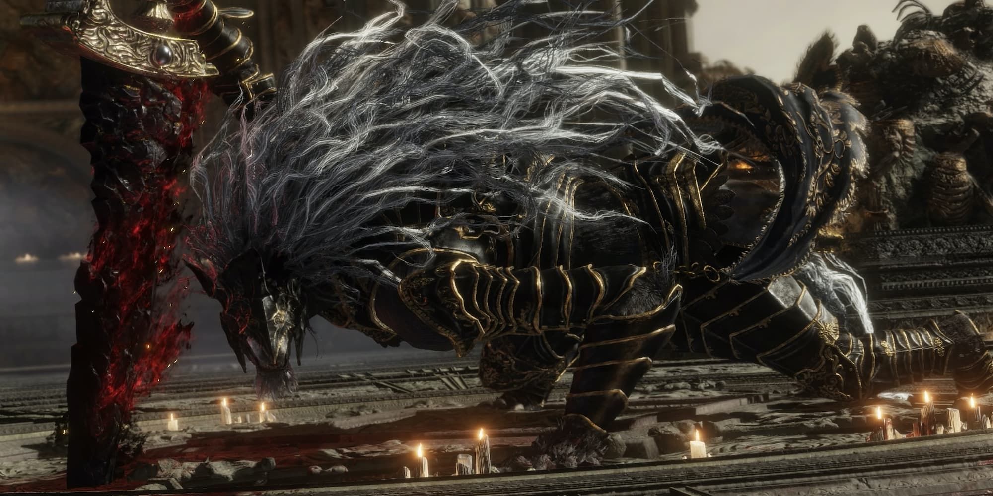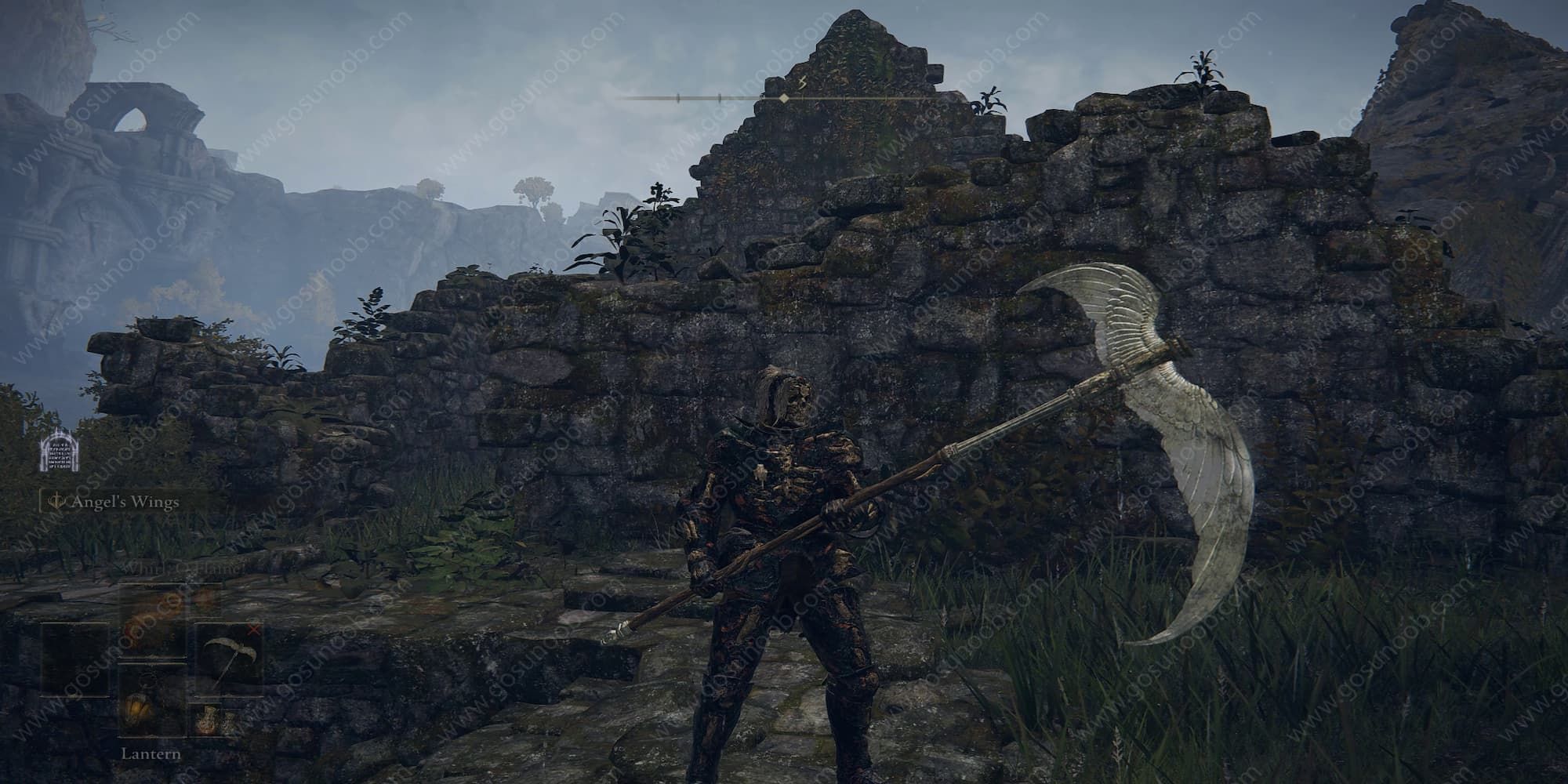 Erdtree Bow, Blasphemous Blade, Winged Scythe를 들고 있는 플레이어