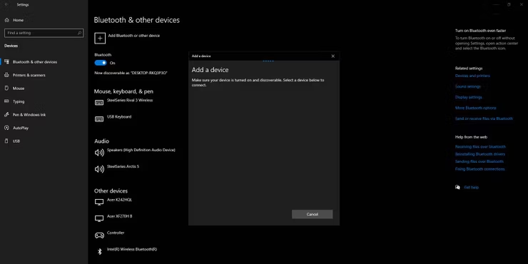 Windows의 Bluetooth 메뉴에 있는 장치 추가 창.