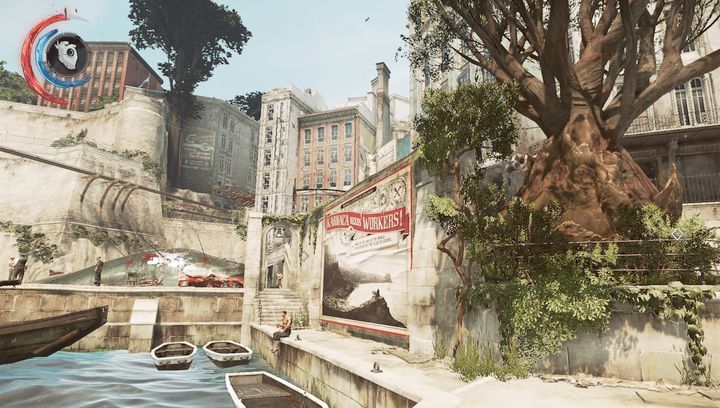 해당 건물을 탐색한 후 거리로 이동하여 Dunwall 로 더 이동하기 시작 합니다. 스크린샷에 표시된 순간 오른쪽 벽에 걸려 있는 지도 를 얻을 수 있습니다. 경비병을 죽이고 싶지 않다면 지도를 얻을 수 있는 유일한 방법은 오른쪽 아래 운하를 통해 몰래 들어가 스크린샷에 보이는 작은 통로를 이용하는 것입니다. 지도는 반대쪽 벽에 걸려 있습니다.