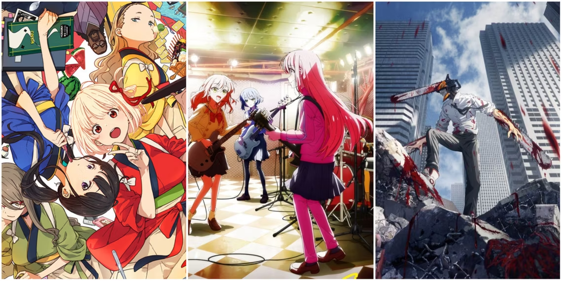 Lycoris Recoil, Bocchi the Rock, Chainsaw Man을 보여주는 2022년 최고의 애니메이션에 대한 AnimeAnime.jp의 설문 조사 배너
