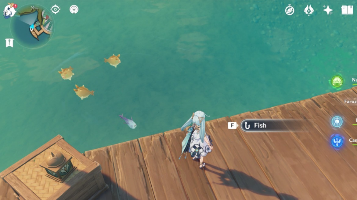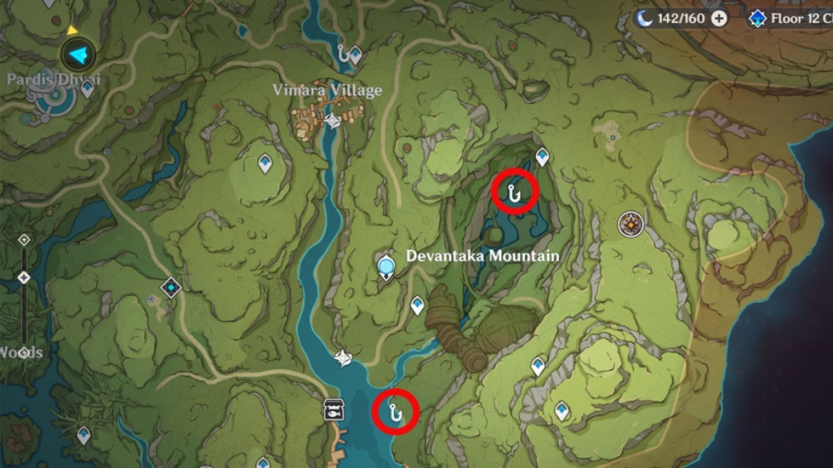 Sumeru 에는 9개의 다른 낚시터 가 있습니다 . 그 중 6개는 열대우림에 속하고 나머지 2개는 사막의 강입니다. 아침(06:00~18:00)과 밤(18:00~06:00)에 다른 물고기를 얻을 수 있으며, 잡은 후 3일(실제)에 다시 부활합니다.