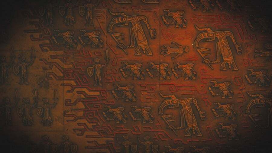 여기서 주목할 가치가 있는 것은 문에 있는 휘장입니다. 뱀입니까? 정말 긴 목을 가진 두 마리의 닭처럼 보입니다. BOTW에는 Triforce의 세 여신을 나타내는 세 마리의 용이 있었지만 용일 수도 있습니다. 이 원 뱀 테마는 나중에 로고에서도 다시 나타납니다. 아마도 중요할 것입니다.