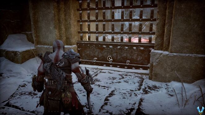 여기에서 다시 내려와 Atreus를 따라가세요. 이 이상한 바닥을 앞에 볼 수 있습니다. 계단을 내려가기 전에 왼쪽 벽을 타고 홀수층이 내려다보이는 지역으로 이동한다. Atreus는 다시 지적합니다. 블레이드를 사용하여 바닥을 폭파하세요. 여기 아래로 내려가 생가죽과 핵실버 의 관을 여세요 .