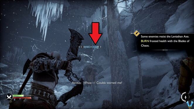 더 많은 Hel-Raiders의 공격을 받기 위해 계속해서 아래로 미끄러지고 몇 개의 선반을 다시 뛰어 내립니다. 영역을 정리한 후 Atreus가 가시나무를 찾으려면 불태워야 합니다. 그렇게 하고 틈새를 꽉 쥐십시오.
