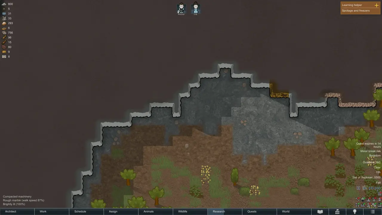 그런 다음 실제로 Architect 메뉴의 Work 탭에서 일부 식민지 주민에게 작업을 할당해야 합니다. 그러나 실수로 산의 외벽을 채굴하지 않도록 주의하세요. 그렇게 하면 이 전체 과정의 목적을 무산시킬 수 있습니다. 침입하는 위협으로부터 거의 뚫을 수 없는 방어 역할을 하기 위해서는 이것들이 필요합니다.