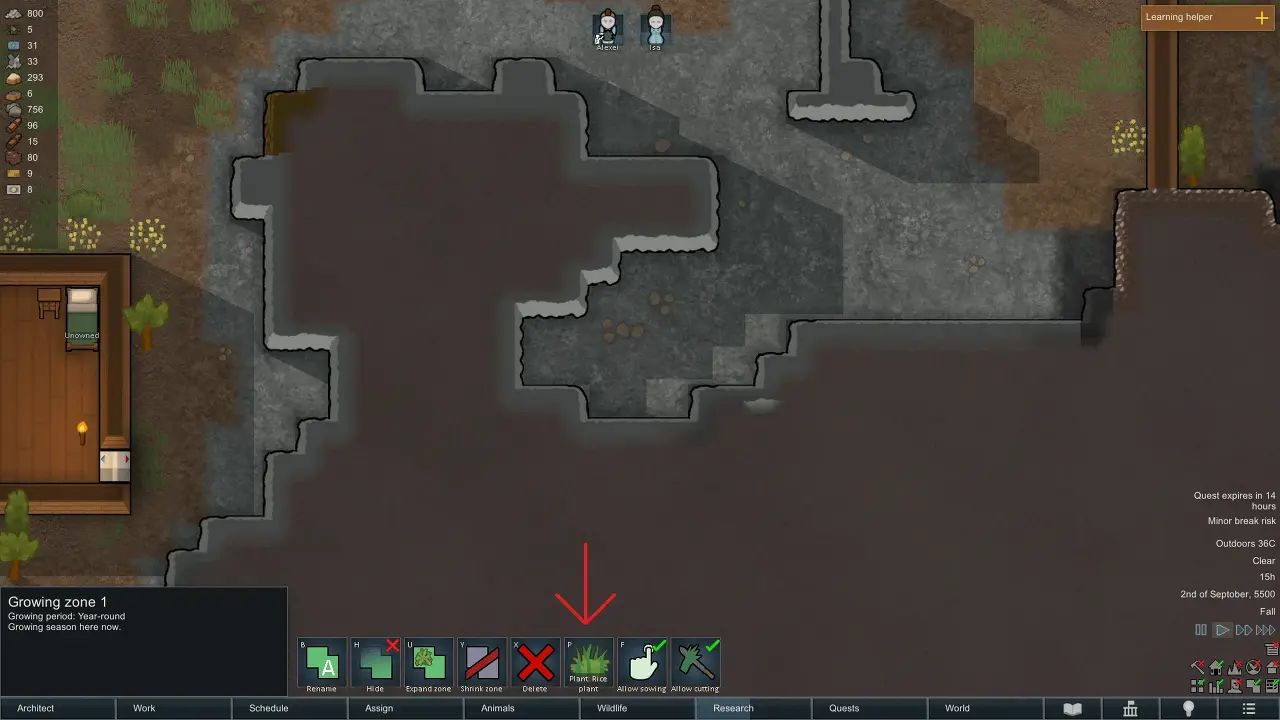 수경재배 대야를 위에 표시된 대로 정확하게 배치하고 모두 전원 도관에 접근할 수 있는지 확인하십시오. 완료되면 전체를 재배 구역으로 지정하고 심을 작물을 선택합니다. 또한 식물 기술에 능숙한 식민지 주민이 해당 지역에서 일하도록 설정되어 있는지 확인하십시오.