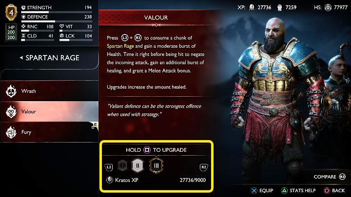 Spartan Rage의 각 변종은 경험치를 소비하여 최대 레벨 3까지 업그레이드할 수 있습니다 .