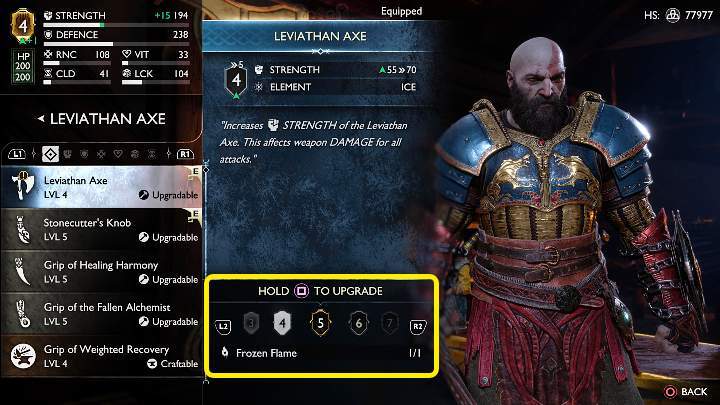 - Leviathan Axe : Axe를 업그레이드하려면 Frozen Flame 이 필요합니다 .
