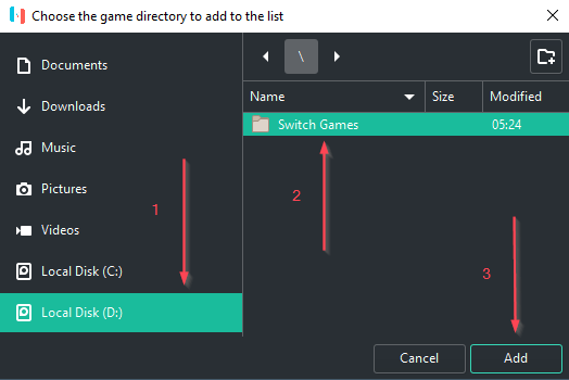 그러면 내비게이션 창이 나타납니다. 게임이 포함된 폴더(예: D:\Switch Games)로 이동하고 추가 를 클릭 합니다.