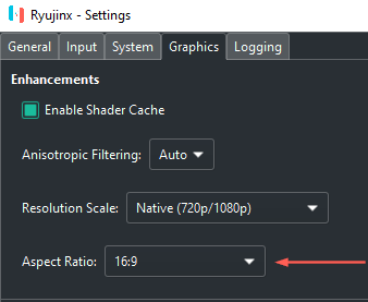 - Ryujinx가 열린 상태에서 옵션 > 설정으로 이동하고 그래픽 탭을 클릭합니다. 종횡비 드롭다운을 클릭하고 원하는 대로 비율을 조정합니다.