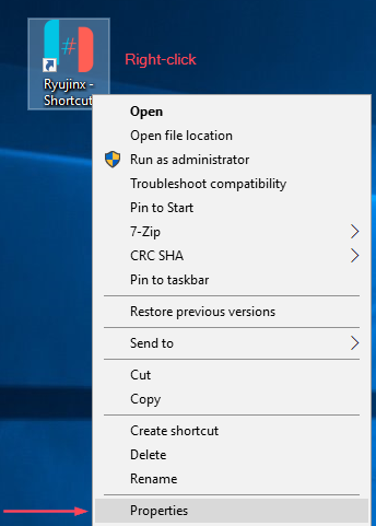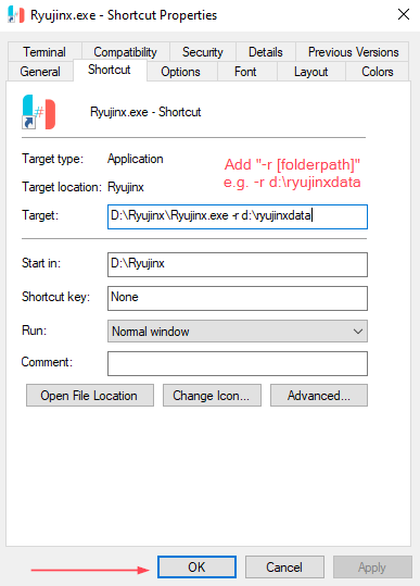 - 속성 창에서 대상 필드를 클릭하고 기존 명령 끝에 공백을 추가합니다. 그런 다음 "-r [folderpath]"를 따옴표 없이 추가하고 [folderpath]는 사용자 지정 데이터 폴더의 전체 경로이며 확인을 클릭합니다. 예를 들어 사용자 지정 데이터 폴더가 d:\ryujinxdata인 경우 대상 필드에 붙여넣는 추가 항목은 따옴표 없이 "-rd:\ryujinxdata"가 됩니다.