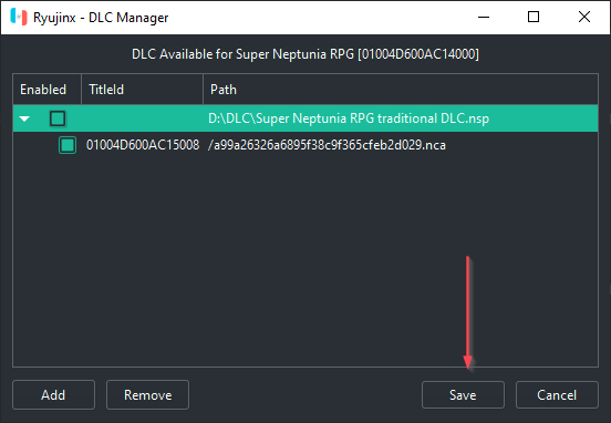그러면 Ryujinx -- Title Update Manager 창으로 돌아갑니다. Ryujinx 에 추가하려는 다른 게임 버전 업데이트 파일에 대해 이 작업을 반복할 수 있습니다 . - Ryujinx - Title Update Manager 창에서 게임에 적용하려는 업데이트 버전을 선택하고 저장 을 클릭 합니다.